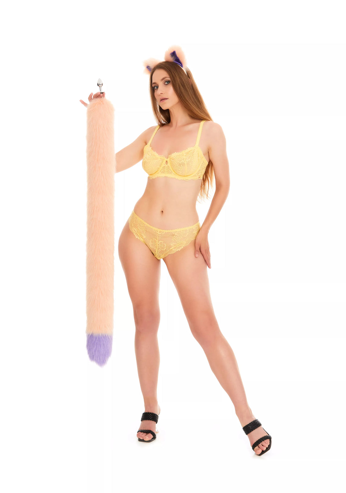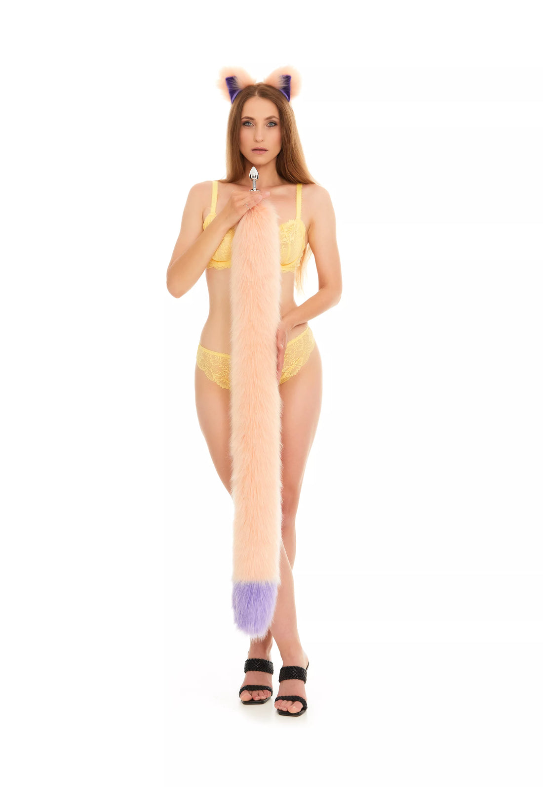 The Tail Butt Plug Peach with Purple Tip 40" is a unique and playful addition to your collection of adult toys. The high-quality faux fur tail is a beautiful peach color with a striking purple tip, measuring 40 inches in length. The butt plug is available in either metal or silicone, depending on your preference. This product is handmade and comes with worldwide shipping and a 100% privacy guarantee. Whether you're looking to spice up your sex life or indulge in some playful role-playing, the Tail Butt Plug Peach with Purple Tip 40" is sure to satisfy your desires.